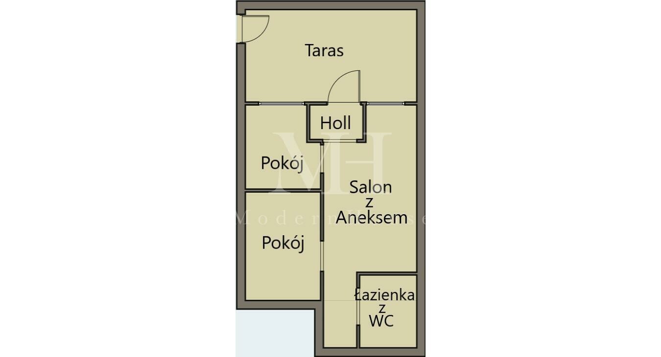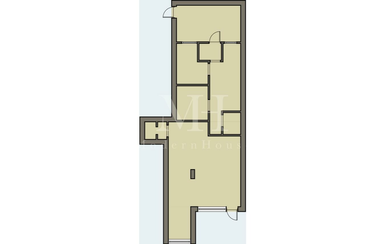 - Lokal mieszkalny (48,62 m²) – w pełni wykończone, nowoczesny lokal (mieszkanie) z tarasem o powierzchni 23,36 m², sprzedawane z wyposażeniem oraz pewnym najemcą, który generuje stabilny dochód. Wejście do lokalu prowadzi wyłącznie przez taras, co zapewnia prywatność.