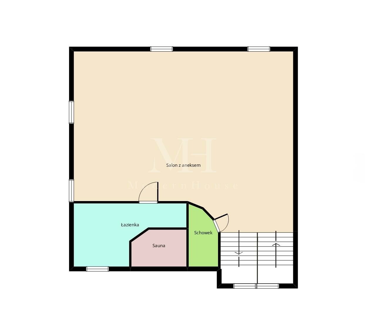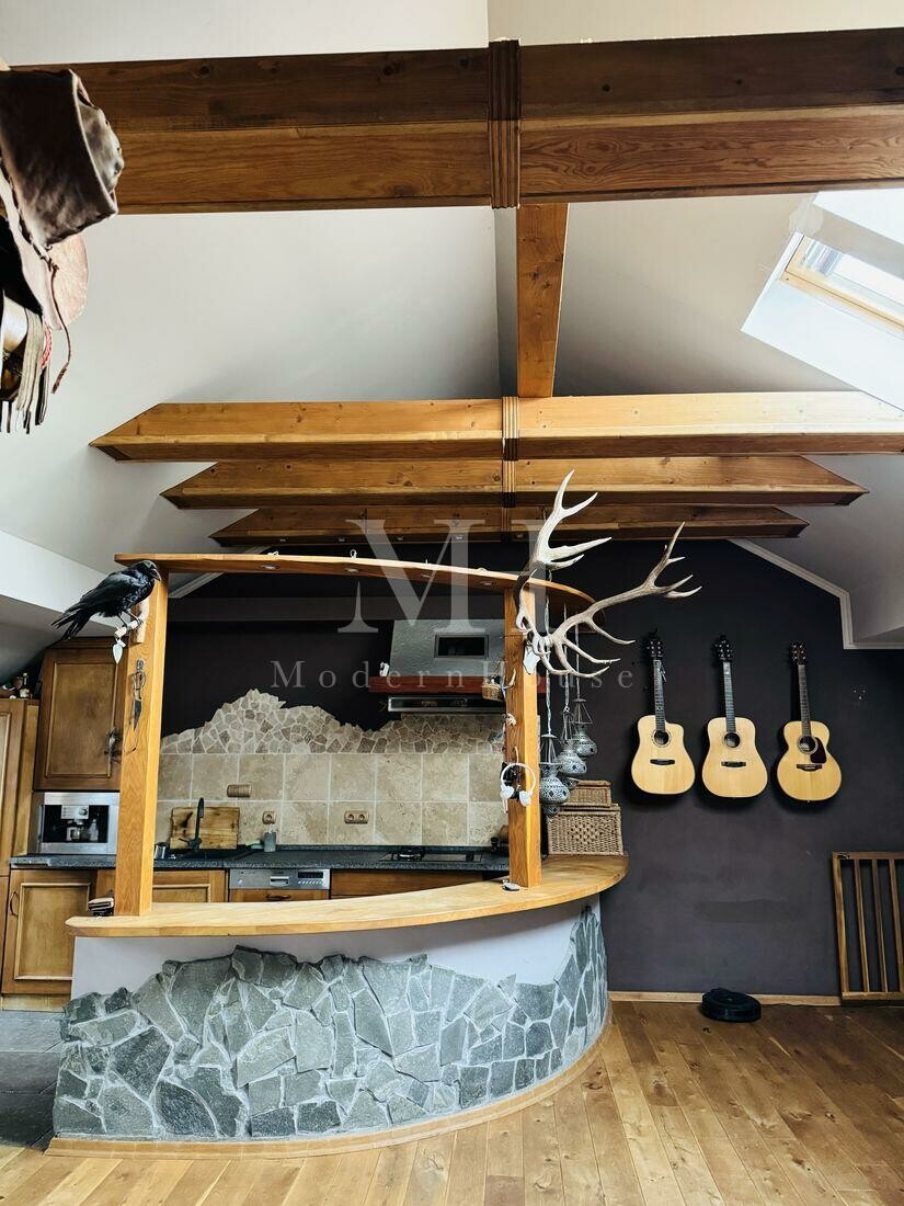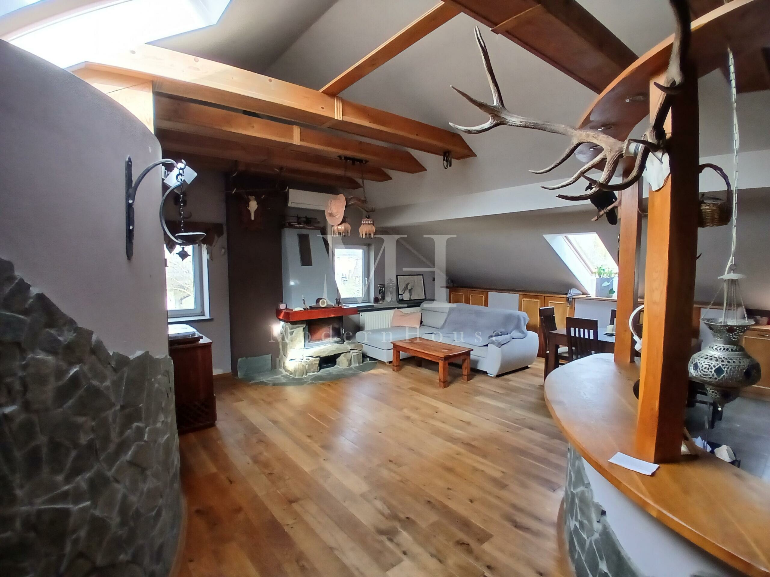 To idealna propozycja dla osób szukających klimatycznego wnętrza z charakterem, łączącego naturalne materiały takie jak drewno i kamień, a jednocześnie funkcjonalnego układu pomieszczeń.